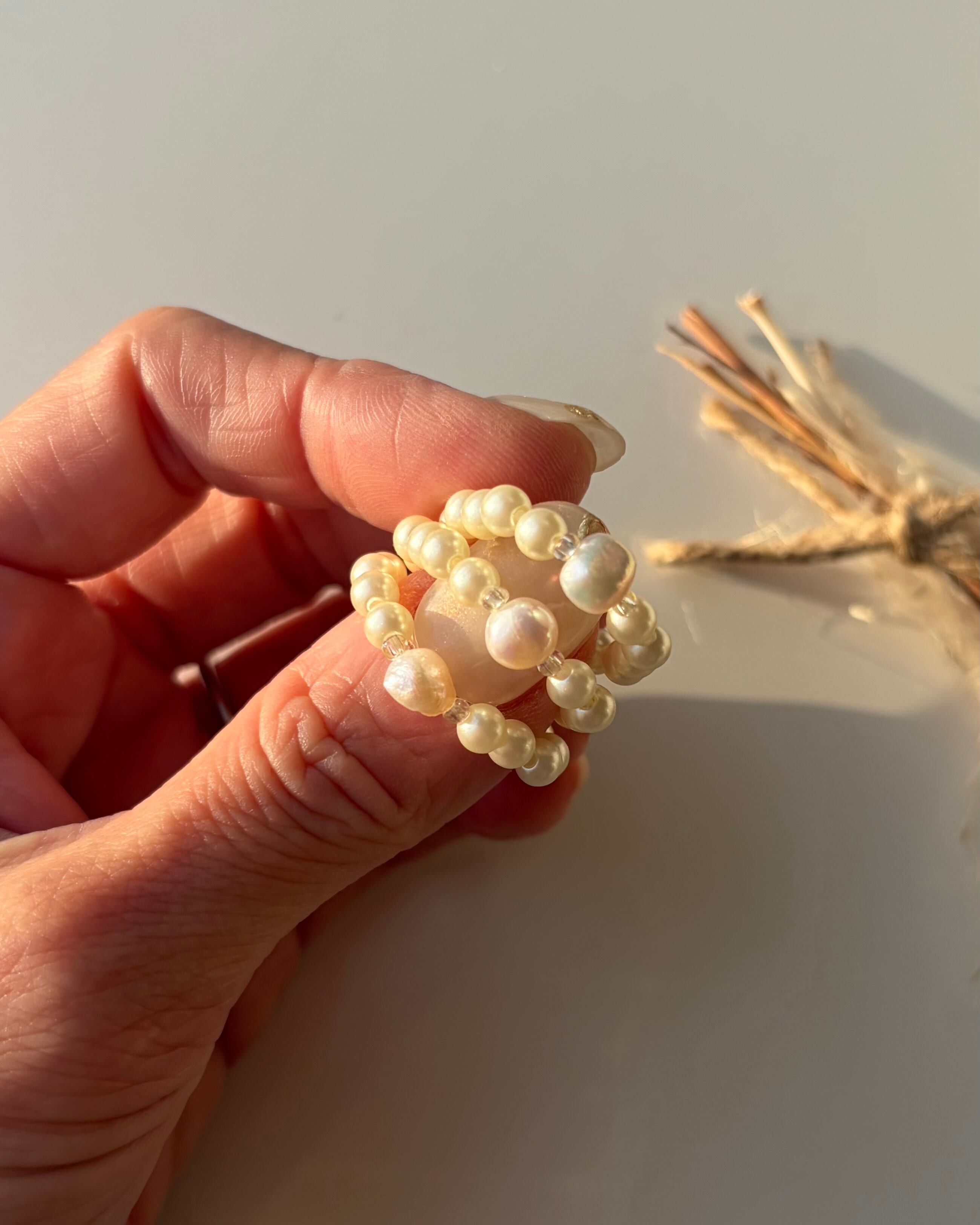 淡水パールと淡い黄色のパールでお作りしたリング.